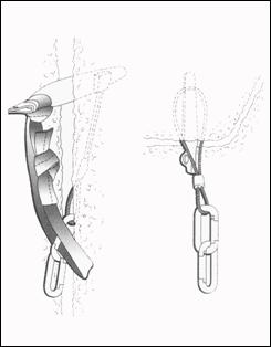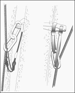 | گاهی در مسیرهای دیواره های ابزاری که بهمراه داریم مناسب جایی نیست که باید در آن حمایت میانی نصب کنیم . در این می توان با کمی ابتکار و ترکیب لوازم حمایت مناسبی را بوجد آورد. معمولا ترکیب یک کیل با میل ضخامت مورد نیاز را تامین می کند . اما در این میان یک نکته مهم را نباید فراموش کرد. در صورتیکه ابزار از جای خود در آید آن ابزاری که بعنوان ضامن از آن استفاده شده به پایین پرت می شود! برای جلوگیری از این کار می توان همانند شکل از تسمه یا طنابچه های کمکی بهره جست تا از پرت شدن وسیله جلوگیری شود. |